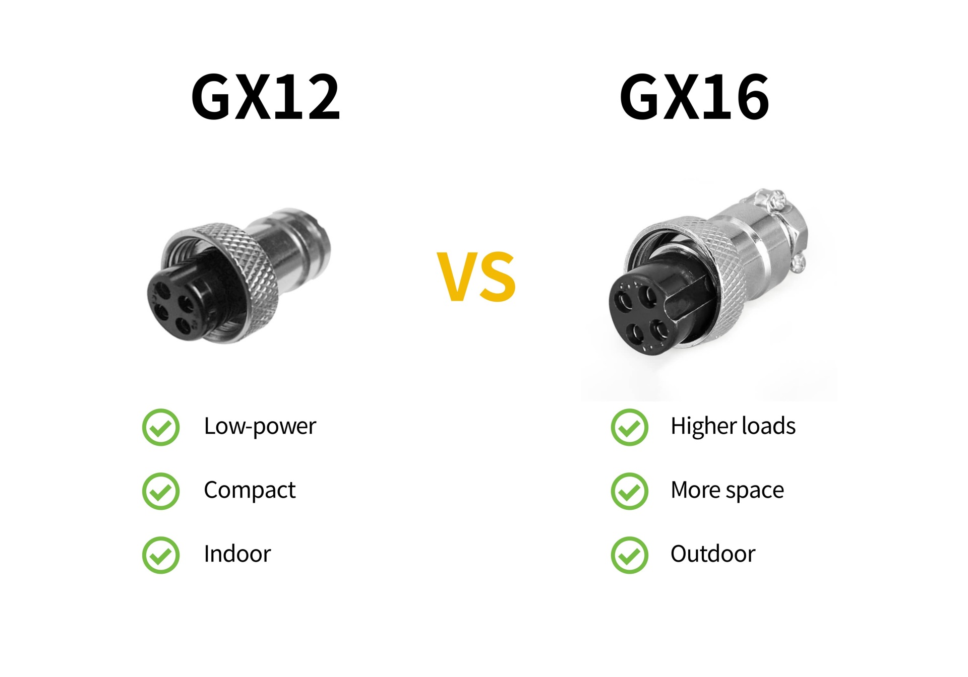GX12 and GX16 connectors may look similar, but their specifications make them suited for very different applications.