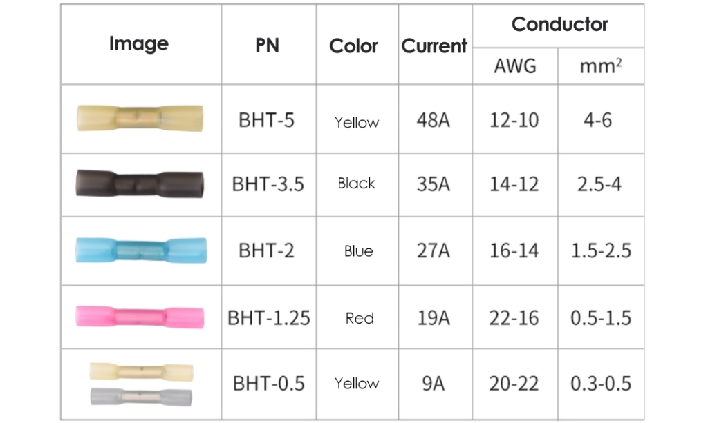 - There are different size of waterproof heat shrink butt connector for 0.3²-6mm²(22-10AWG) wires , please choose the right connector , or the connection or sealing may not be good . Normally manufactures will use different color connector for different conductor wire size .