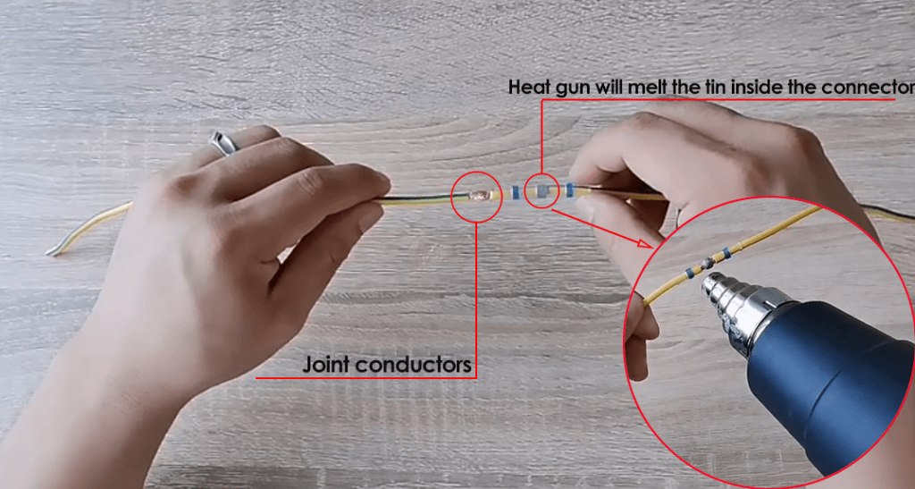 For the heat connection shrink waterproof butt connector , there is tin inside the connector , after the conductor are joint together , use a heat gun will melt the tin , and after the tin cool down , the conductors will be soldered together .