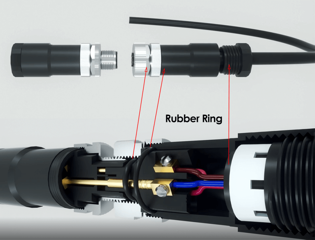 As we can see from above picture , there are 3 rubber rings in the M12 field wireable connector to seal the male-female connection , seal the cable and connector connection .