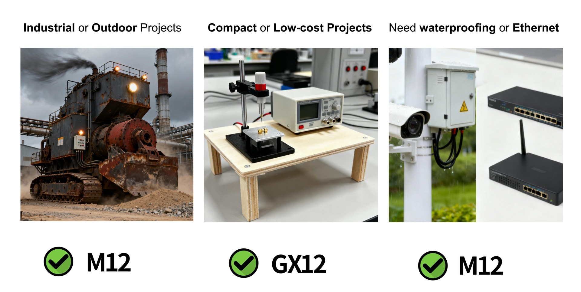 • For compact or low-cost projects → Choose GX12 connectors, ideal for small devices and bench projects.