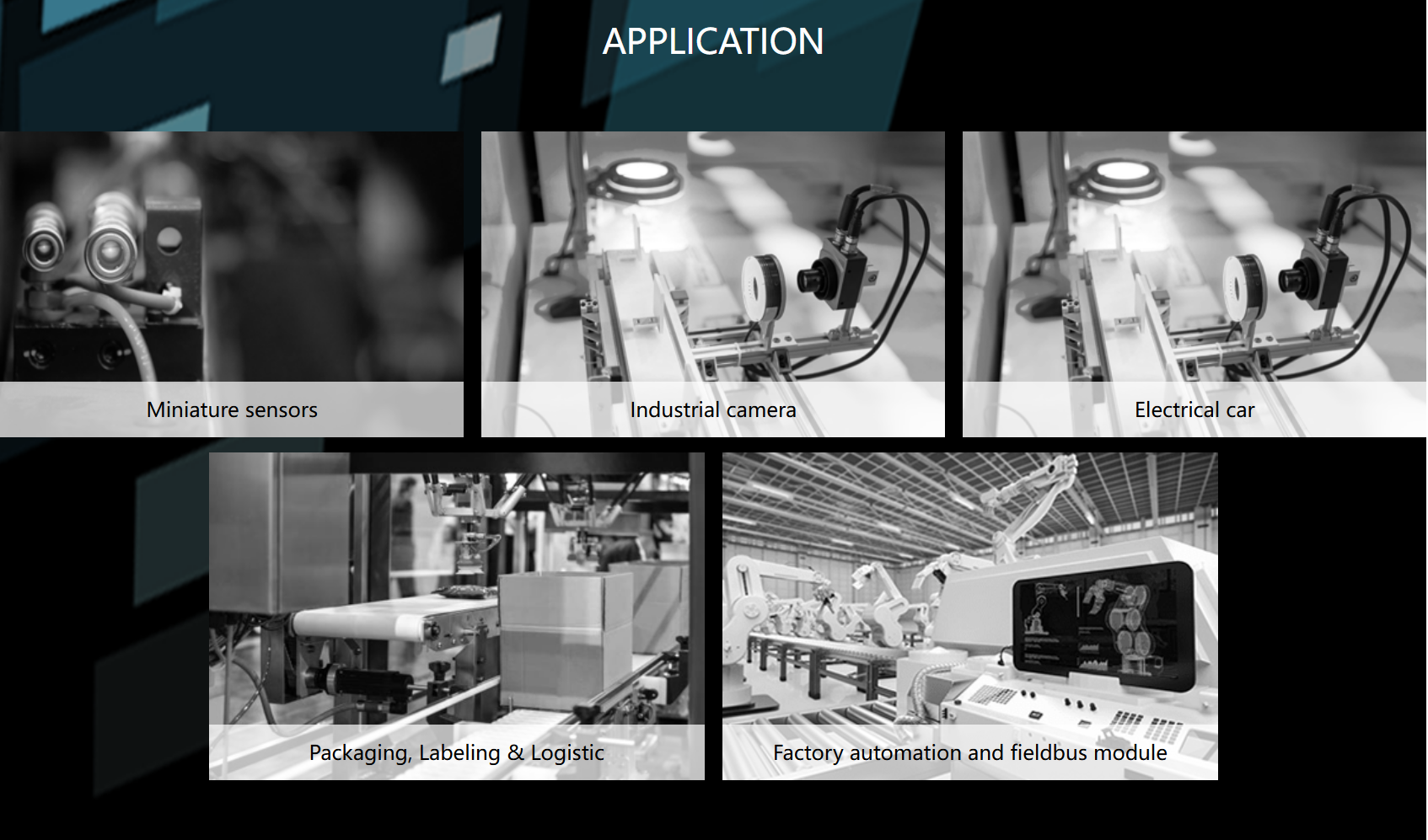 Robotics, Communication equipment, Measurement systems, Smart agriculture, Miniature sensors, Industrial camera, Electrical car, Packaging&Labeling & Logistic, Factory automation and fieldbus module