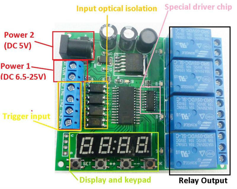 4 channel relay,each channel independently triggered independent delay, do not interfere with each other.