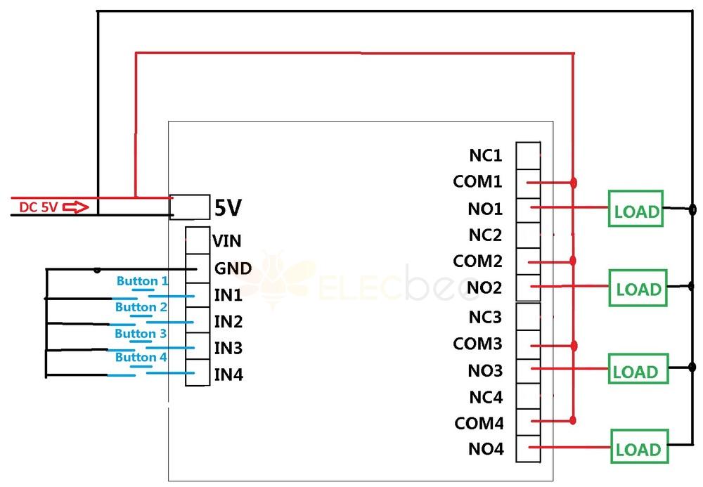 2 DC 5V control circuit,Wiring diagram below. "LOAD" may be LED lights, fans, toy car and other DC 5V equipment
