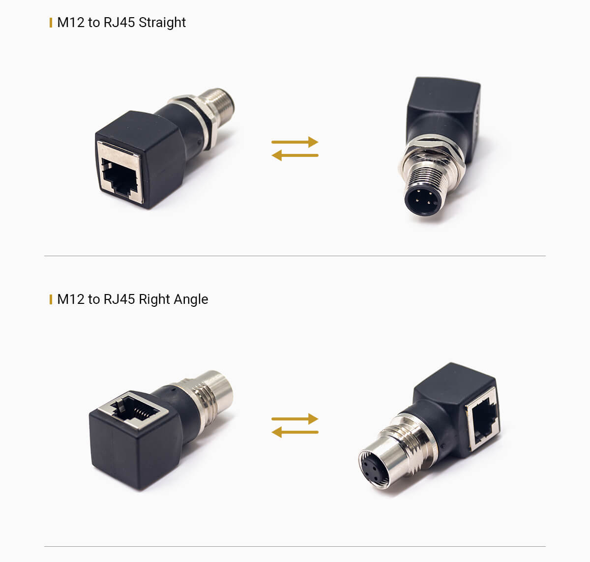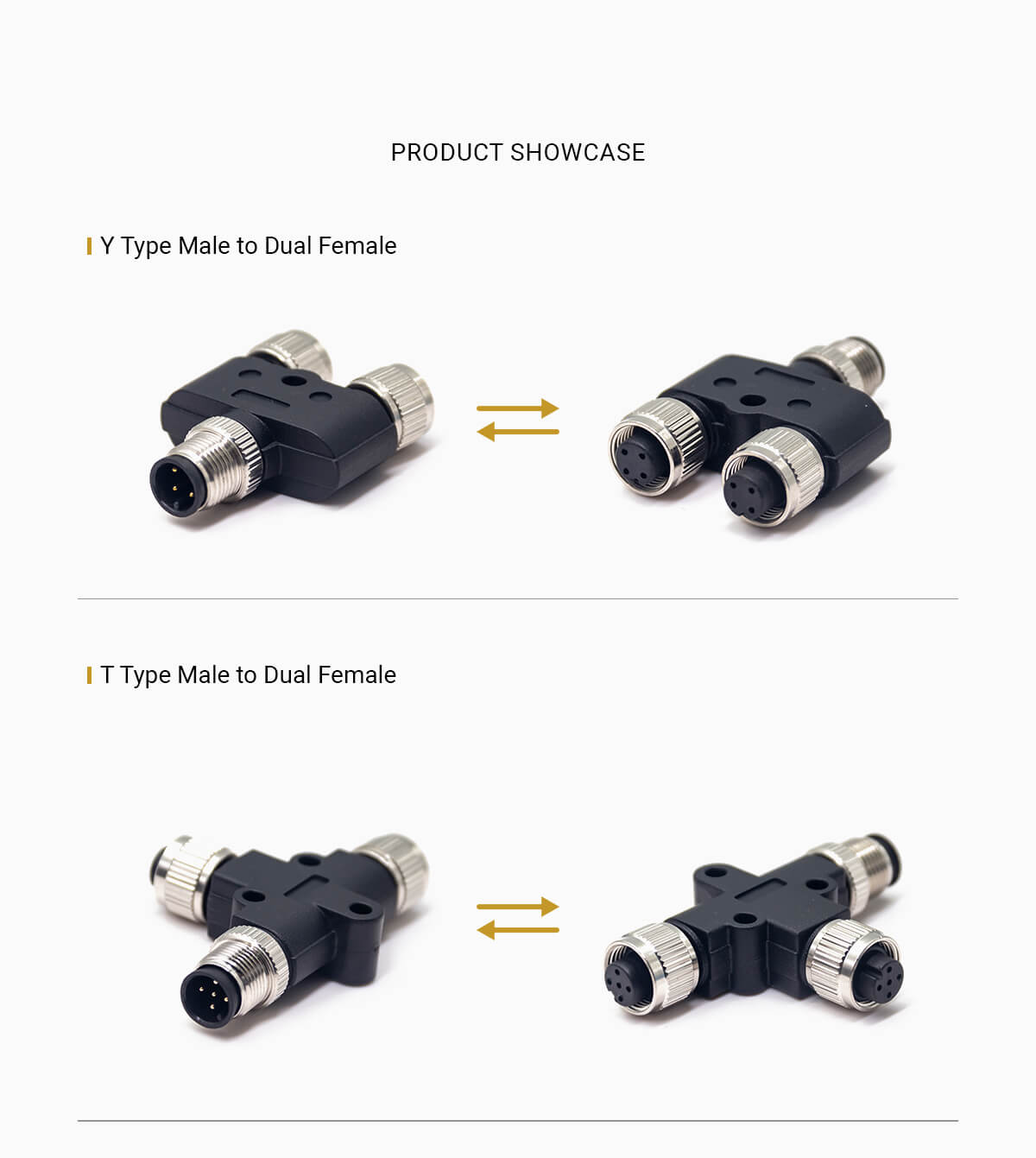 M12 Y type or T type Splitter helps to splits wires into 2 separate connectors, allowing installation of two single-channel input or output devices to each port of hardwired distribution box. Connectors are available with parallel circuits, which allow input or output signals to run or trigger devices simultaneously. Also provide M12 to RJ45 adapters to convert M12 to RJ45 ethernet signals.