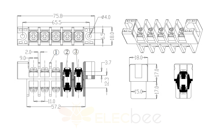 The Feed Through Terminal Block is handy for connecting wires. It is actually a piece of metal enclosed in insulating plastic. There are holes at both ends to insert wires, and there are screws for fastening or loosening.