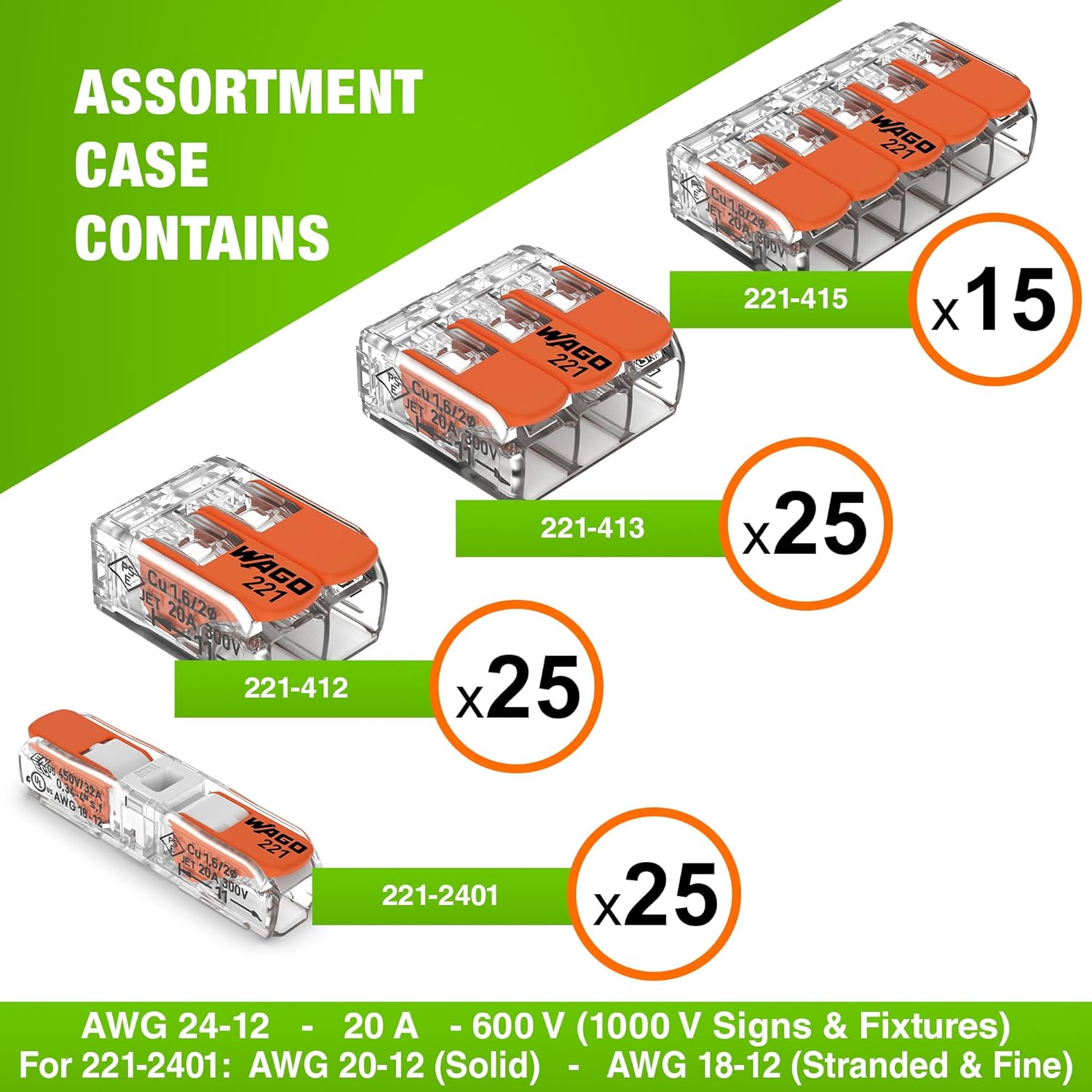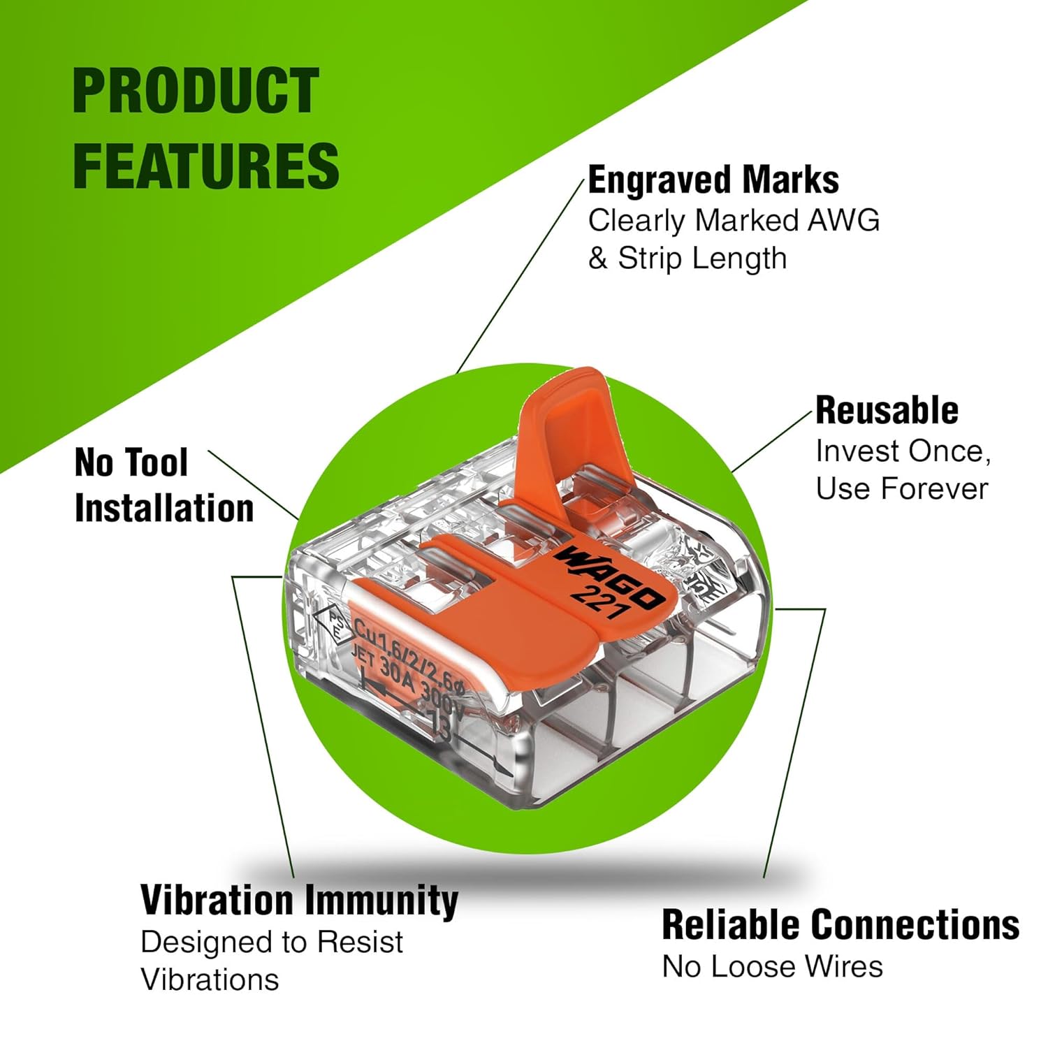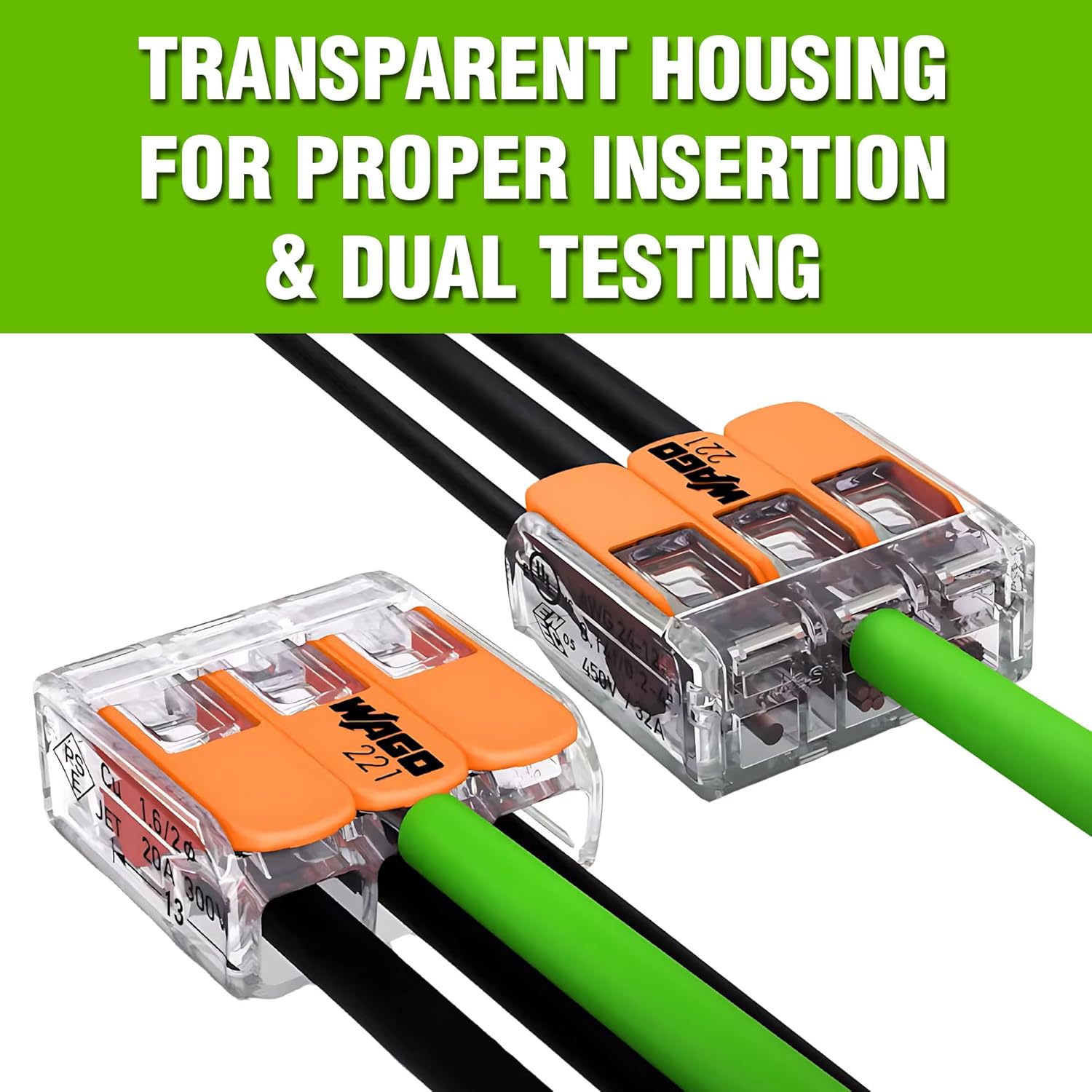 Our splicing connector with levers (item number 221-415) ensures effortless electrical installations. From wiring intercom systems to installing electrical ovens, connecting different conductor types is quick and hassle-free with compact 221 Series splicing connector, which allows you to quickly and safely connect different types of conductors. This splicing connector has a rated voltage of 450 V and can handle currents up to 32 A, making it suitable for high-load applications. Ensure that the strip lengths are 11 mm when connecting conductors to splicing connector with levers. This product incorporates conductor terminals. Our connection offers a proven and maintenance-free way to connect all types of conductors. You do not need to prepare the conductor in any way, such as crimping ferrules. The dimensions are 30 x 8.4 x 18.6 mm (width x height x depth). Depending on the type of conductor, splicing connector with levers is suitable for conductor cross sections ranging from 0.2 mm² to 4 mm².