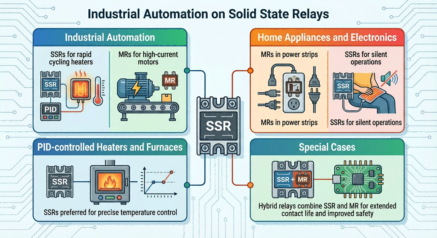 • Домашние приборы и электроника: MR в силовых полосах, SSR для бесшумных операций, таких как нагревательные прокладки.