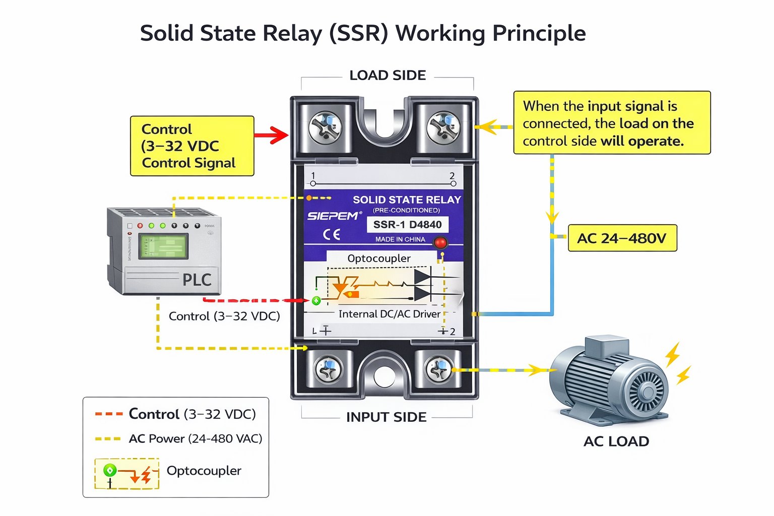 Эстафета твердого состояния работает без движущихся частей. Он использует полупроводниковые устройства, такие как тиристоры, триаки или транзисторы, для переключения электрических нагрузок. Этот дизайн исключает механический износ, что делает SSR идеальными для приложений, требующих частого переключения.