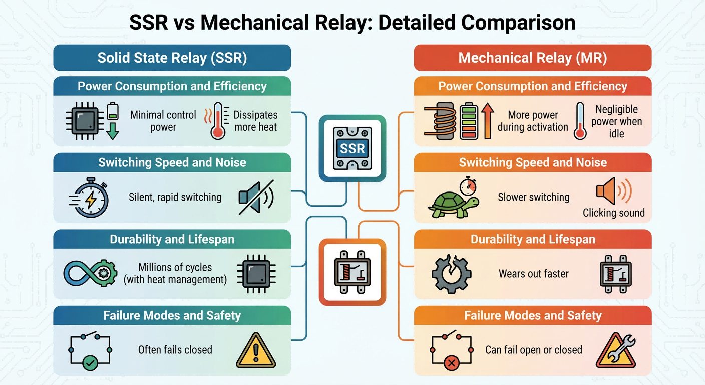 ССР потребляют минимальную мощность для управления и могут быстро переключаться, но они могут рассеивать больше тепла во время работы. Механические реле черпают больше энергии во время активации, но незначительность при простаивании.