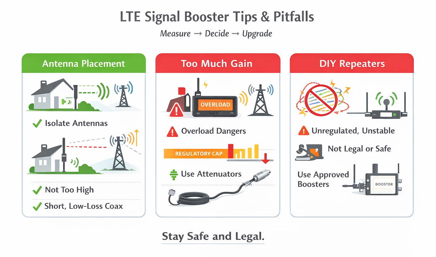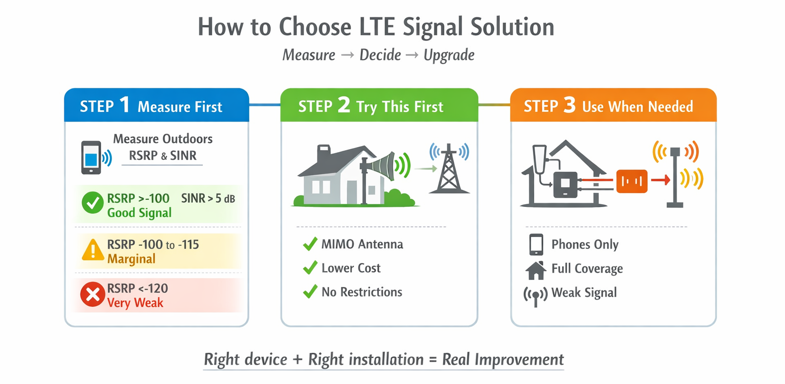Önce ölçün → antenleri ve yerleştirmeleri iyileştirin → ancak daha sonra çok cihazlı iç mekan kapsamına gerçekten ihtiyacınız varsa aktif bir tekrarlayıcı / güçlendirici düşünün.