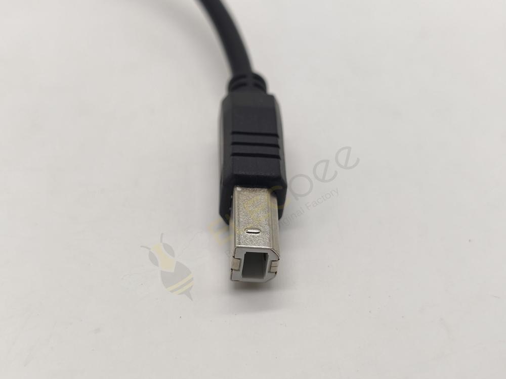 The USB Type-B connector doesn't look much like the USB A and USB-C connectors. The male port is not as wide as the USB A port, and there is a small rectangular hole in the middle.
