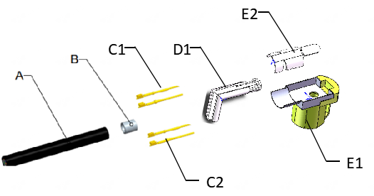 A=HSD wiring harness; B=Shielded copper ring; C1=Center conductor-long; C2=Center conductor-short; D1=Elbow skeleton; E1=Outer conductor with plastic shell; E2=Gland