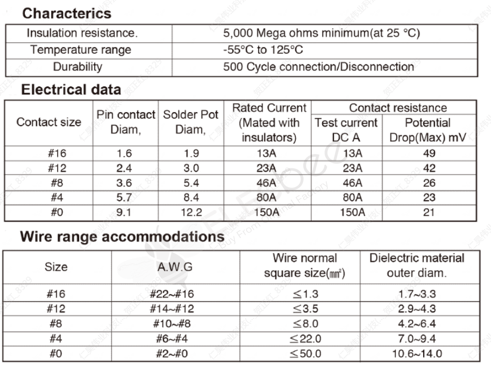 Up to 150 amps for standard military contacts, wire gauges from 24 to size 0 AWG.