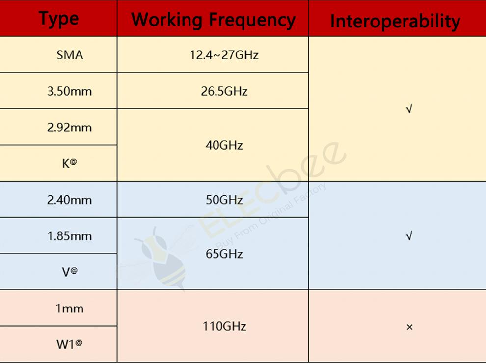 The interconnection of different types of connectors is related to the size of the connector. The specific size of each type is not described in detail here. The maximum operating frequency and interoperability of different types of connectors are given below: