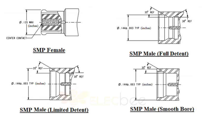 Subminiature push-on (SMP) connectors are plug-in connectors for applications up to 40 GHz. These connectors are easy to connect and disconnect as they can be pushed against each other to make a connection and pulled apart to open the connection. They don't need to be tightened like most other connectors. The force required to connect or disconnect an SMP connector is called the detent. SMP connectors are available in three different brake systems - full bore, limited bore and smooth bore, with respective levels of engagement/disengagement force. They are available in both push-in and snap-in versions.