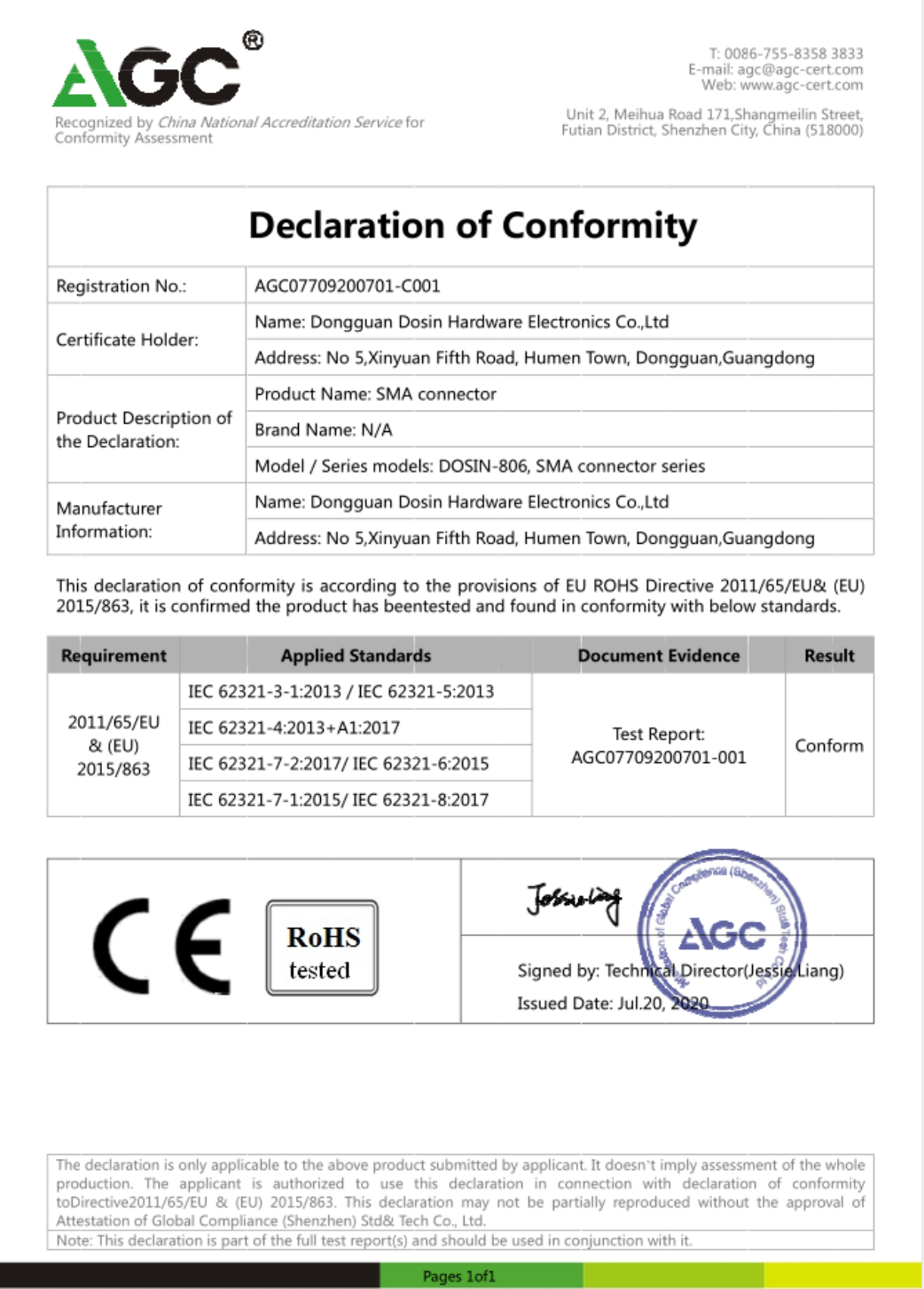 Conectores SMA da Elecbee Ter passado por testes de RoHS de terceiros e cumprir a Diretiva da UE 2011/65/UE e sua emenda (UE) 2015/863, garantindo a segurança dos materiais e a conformidade ambiental.