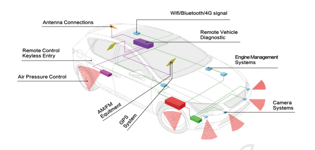 ①无线信号传输:车载AM/FM;视频音影;GPS;天线;车联网;远程控制等