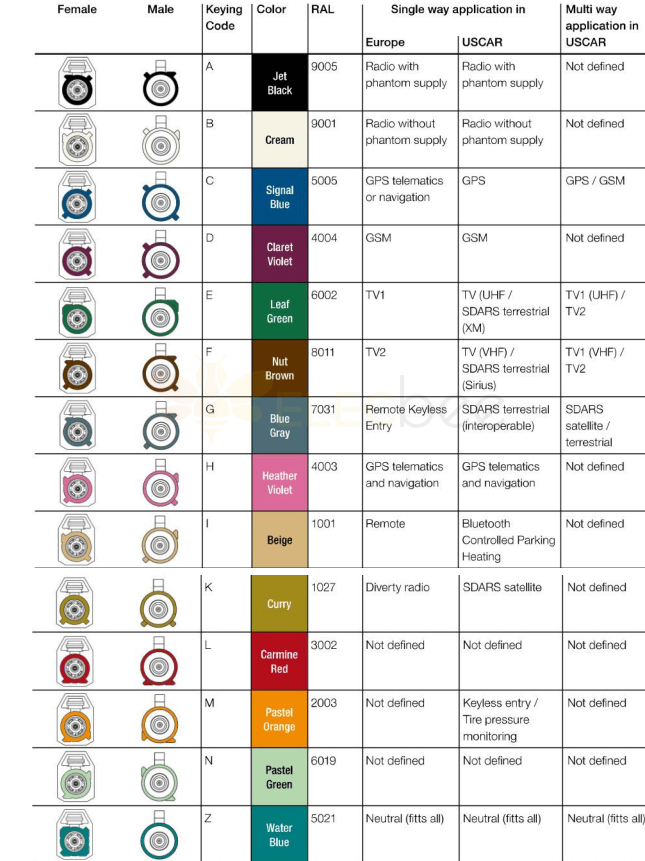 • FAKRA HF-Koaxial-Rundsteckverbinder, entwickelt für die Automobilindustrie mit sekundärer Verriegelungsstruktur;