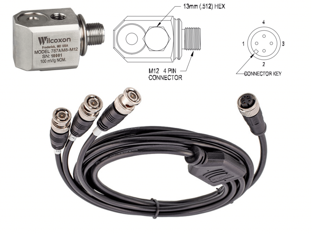 Der M12-Stecker am triaxialen Beschleunigungsmesser ist ein A-kodierter 4-poliger M12-Stecker, und das Verbindungskabel ist ein M12-A-kodierter 4-poliger Buchsenstecker auf 3 BNC.
