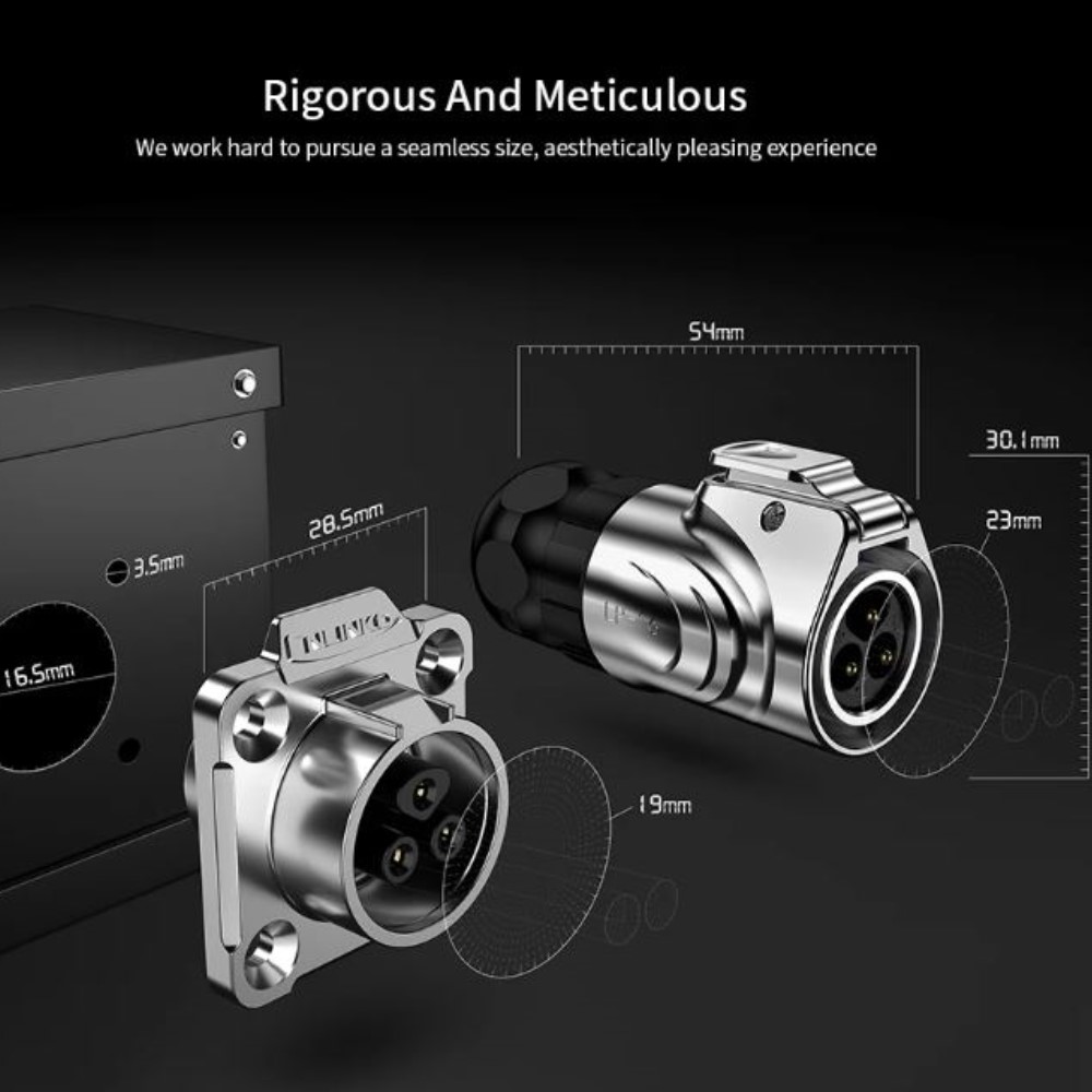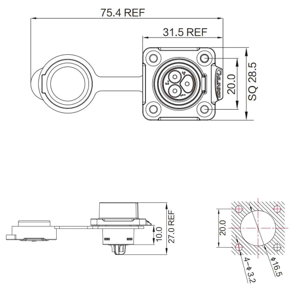 28,5 mm flache Einbautiefe: 26 mm für beengte Gehäuse; kompatibel mit Kabeln der Querschnitte AWG 16–18.