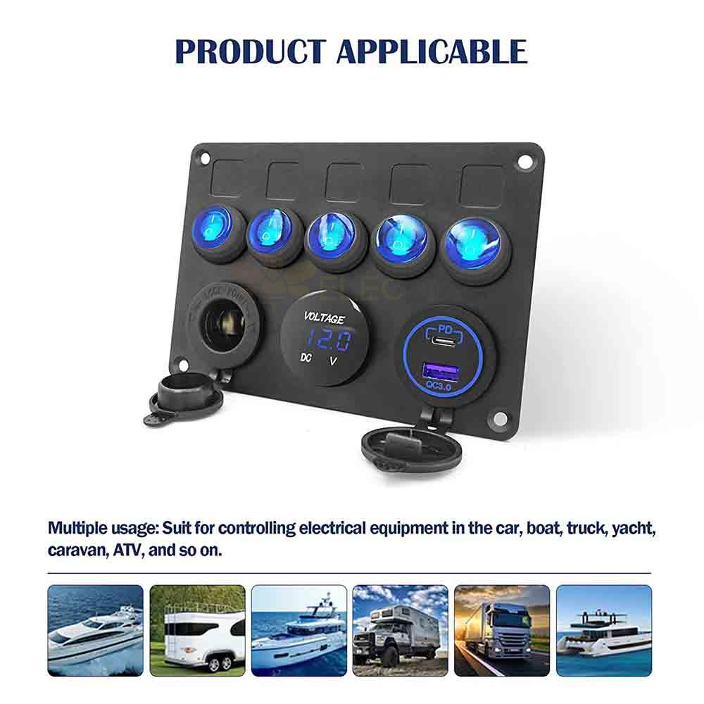 Elecbee Automotive Switch Retrofit 5 Gang Cat Eye Rocker Switch Panel including Dual USB Voltage Display PD3.0 Fast Charging Cigarette Lighter -Green Light