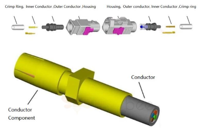 A common FAKRA connector consists of a molded case, outer conductor, center conductor, insulator, crimp sleeve (harness end connector only) and secondary lock (harness end connector only).