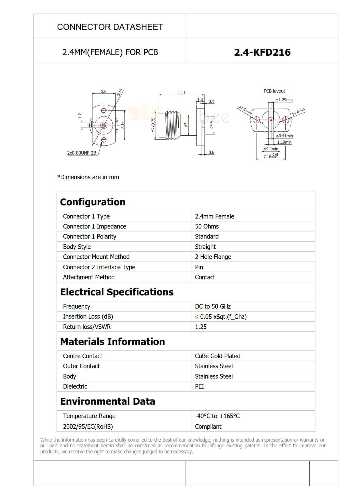 Elecbee 2.4Mm Female Surface The Pcb Mount Dc To 50Ghz 2.4-Kfd216 Rf Coax Connector