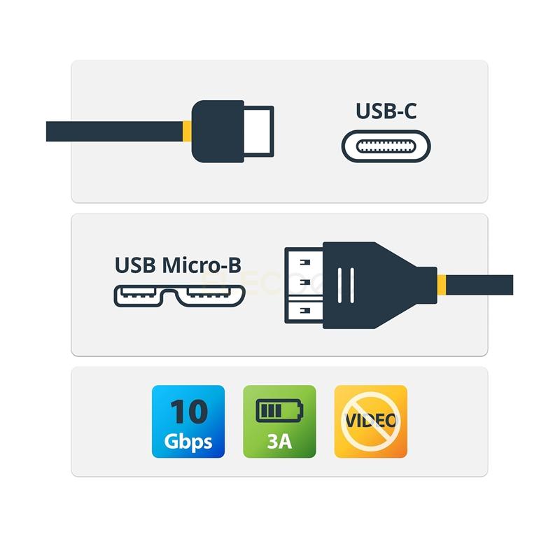 This USB-C to Micro-B cable lets you connect your USB 3.1 (10Gbps) Micro-USB devices to your USB Type-C laptop. You can also charge and sync your USB 3.0 (5Gbps) Micro-USB mobile devices. Connect your devices while you’re on the road This non-standard 0.5-meter cable is great for close-range connections from your USB-C laptop to a USB 3.1 drive enclosure, dock or other Micro-USB device, wherever you go. The short cable lets you set up your equipment without excess cable getting in your way. It’s extremely portable, which is perfect for connections in small offsite workspaces or in a coffee shop or hotel room. With a bandwidth of 10Gbps, this USB 3.1 Gen 2 cable lets you transfer and back up data at twice the speed of USB 3.0 and 20x faster than USB 2.0. You can also connect older USB 3.0 peripheral devices to newer computers, with data transfer speeds of up to 5Gbps. Charge and sync your USB 3.0 Micro-B devices Connect your Micro-USB 3.0 phone or tablet to your USB 3.1 laptop or desktop computer, for syncing and charging.