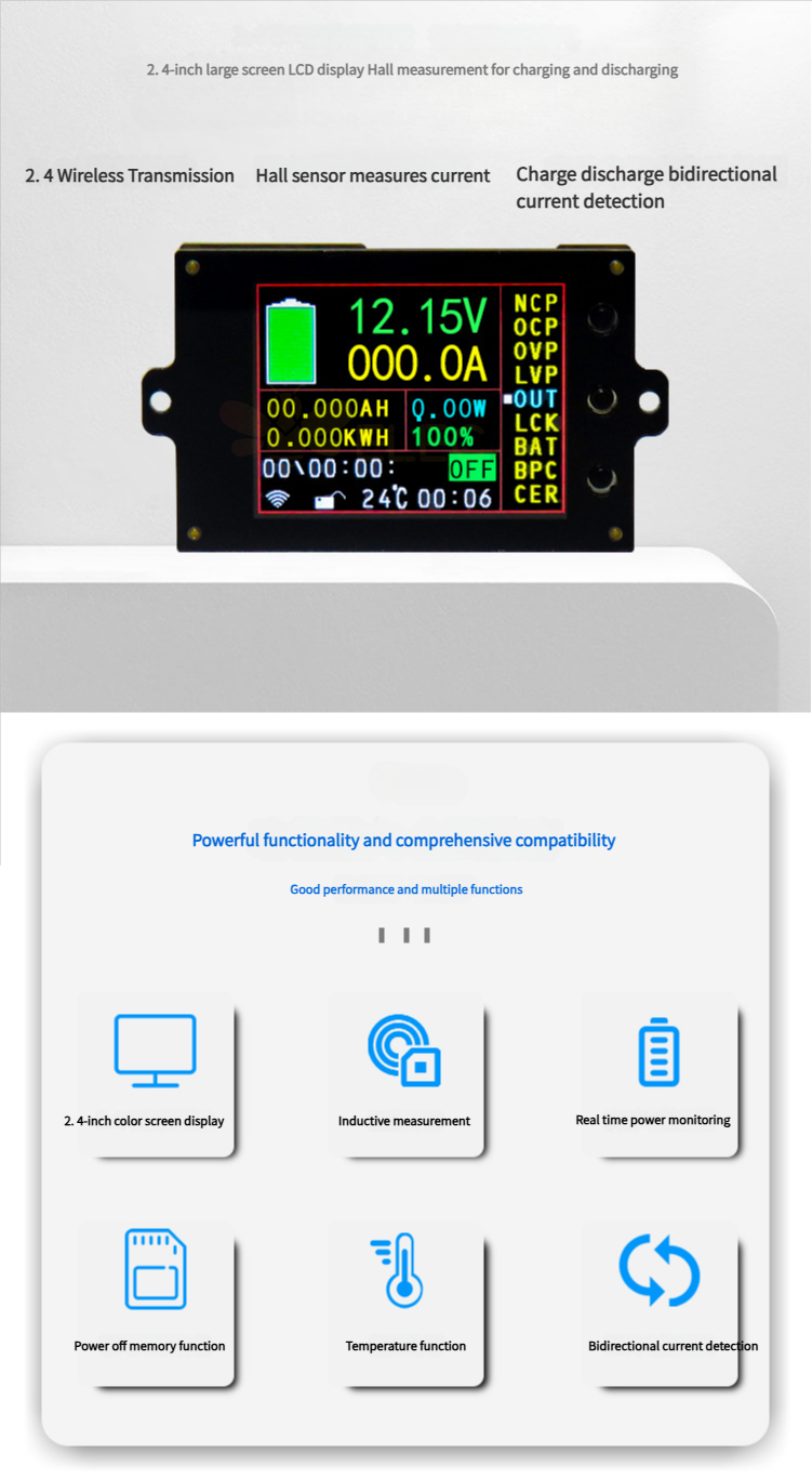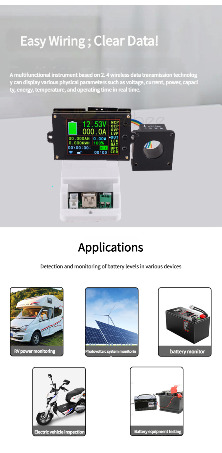 Tracking the charge, discharge and charge status of batteries in a solar system is very convenient. Voltage, current and capacity readings are accurate.