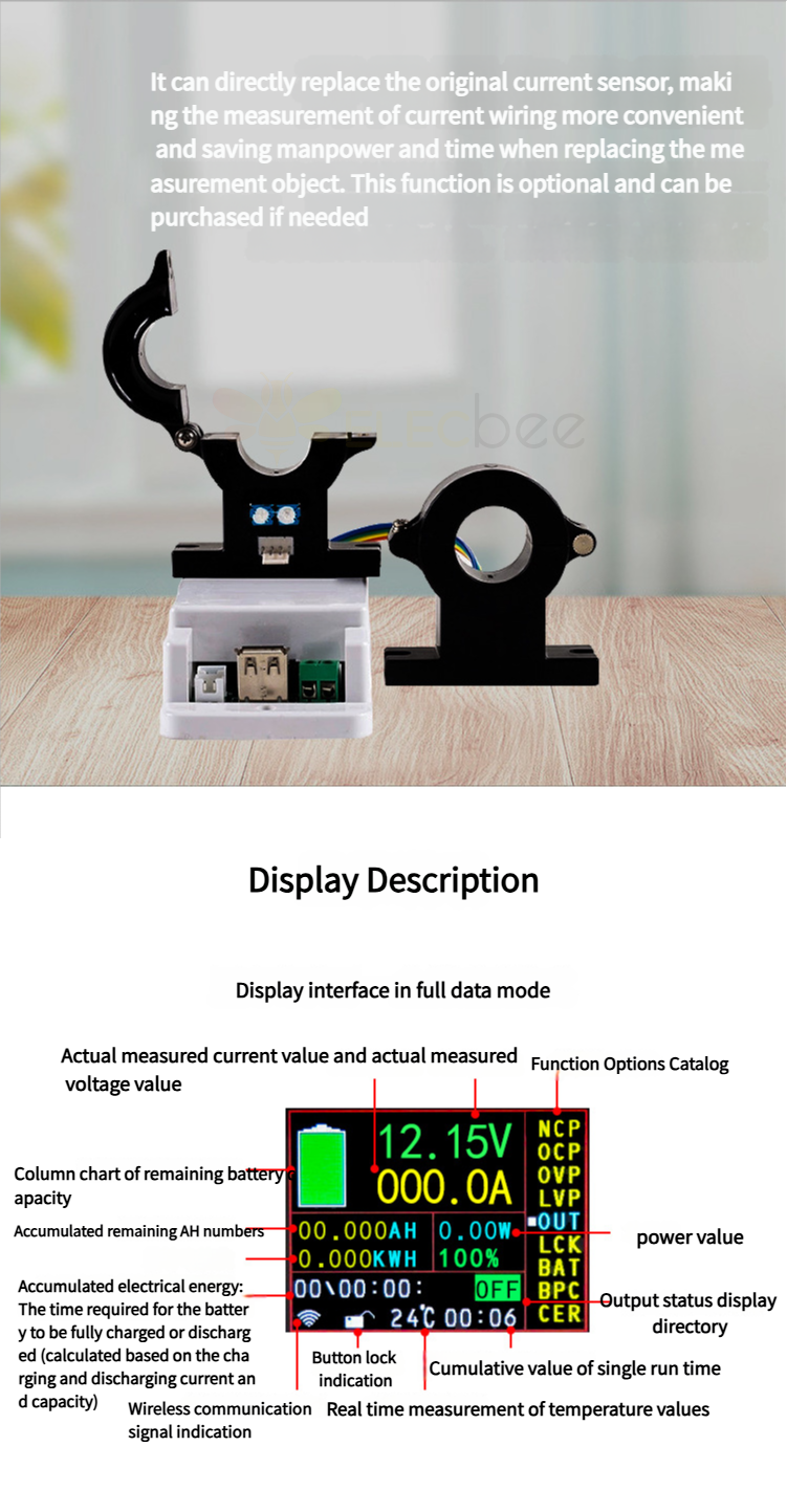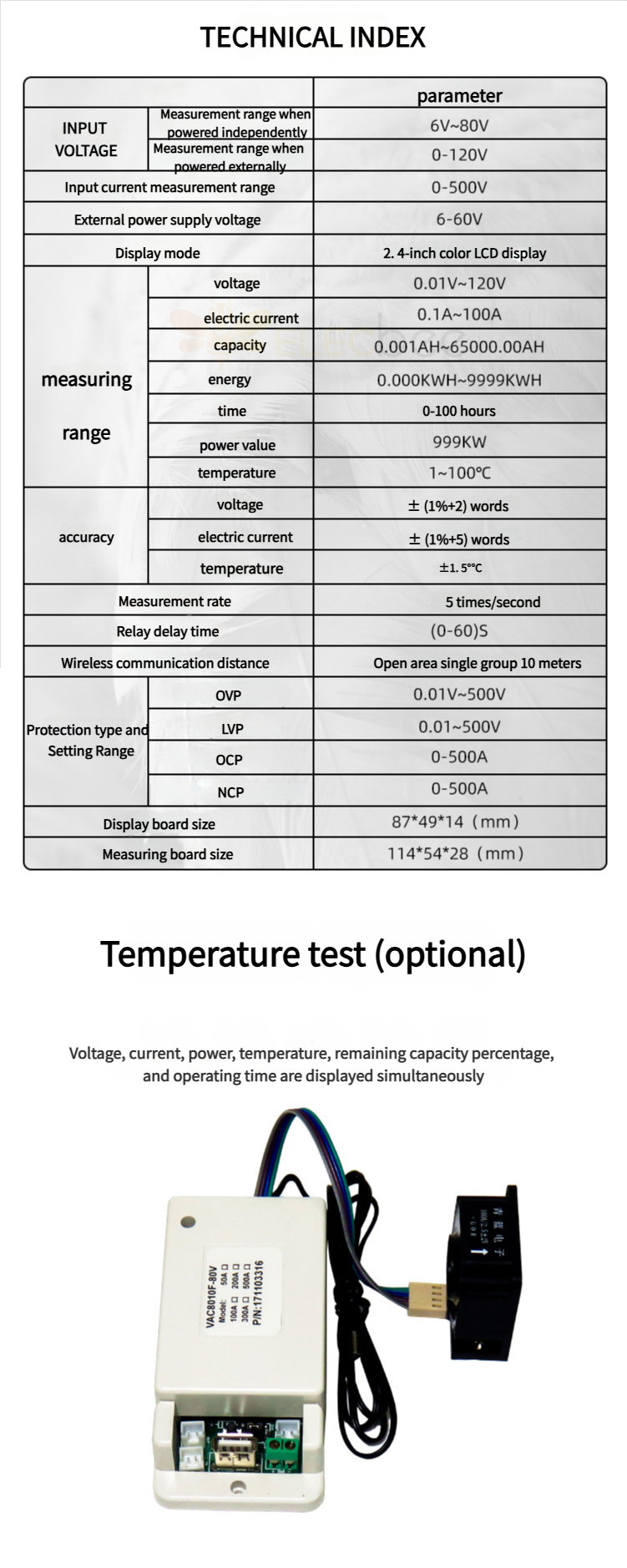 Elecbee DC 500V 50/100/200/300/500A Wireless Voltage Meter Ammeter Coulometer Capacity Power Detector Tester