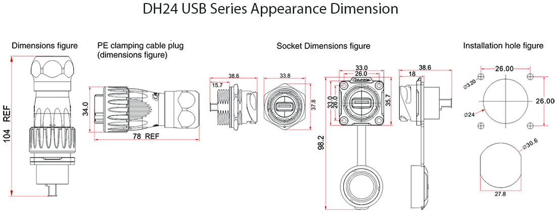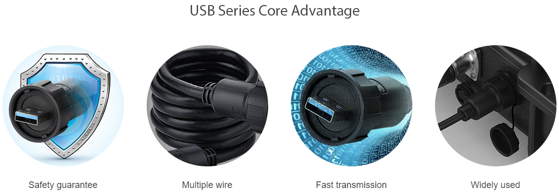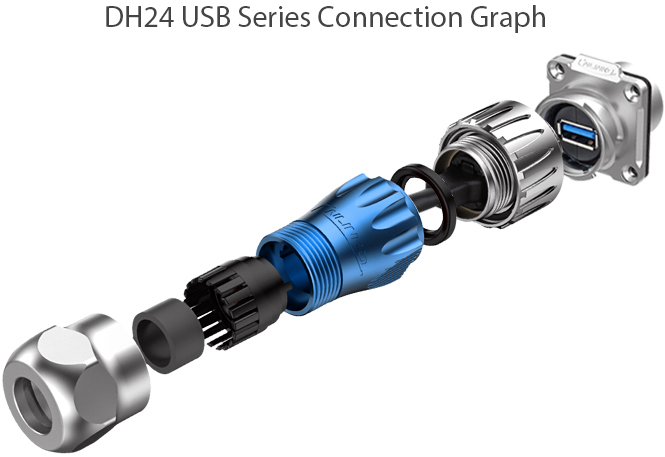 The DH-24 series USB connector has a hole size of 24mm, which meets the needs of different industries. It is nickel-plated with zinc alloy to ensure quality, and it is also suitable for environmental protection requirements of international industrial equipment. Meet the quality and environmental protection requirements of international industrial equipment. Quick-plug design allows one-handed insertion and removal. Features military standard screw style locking.