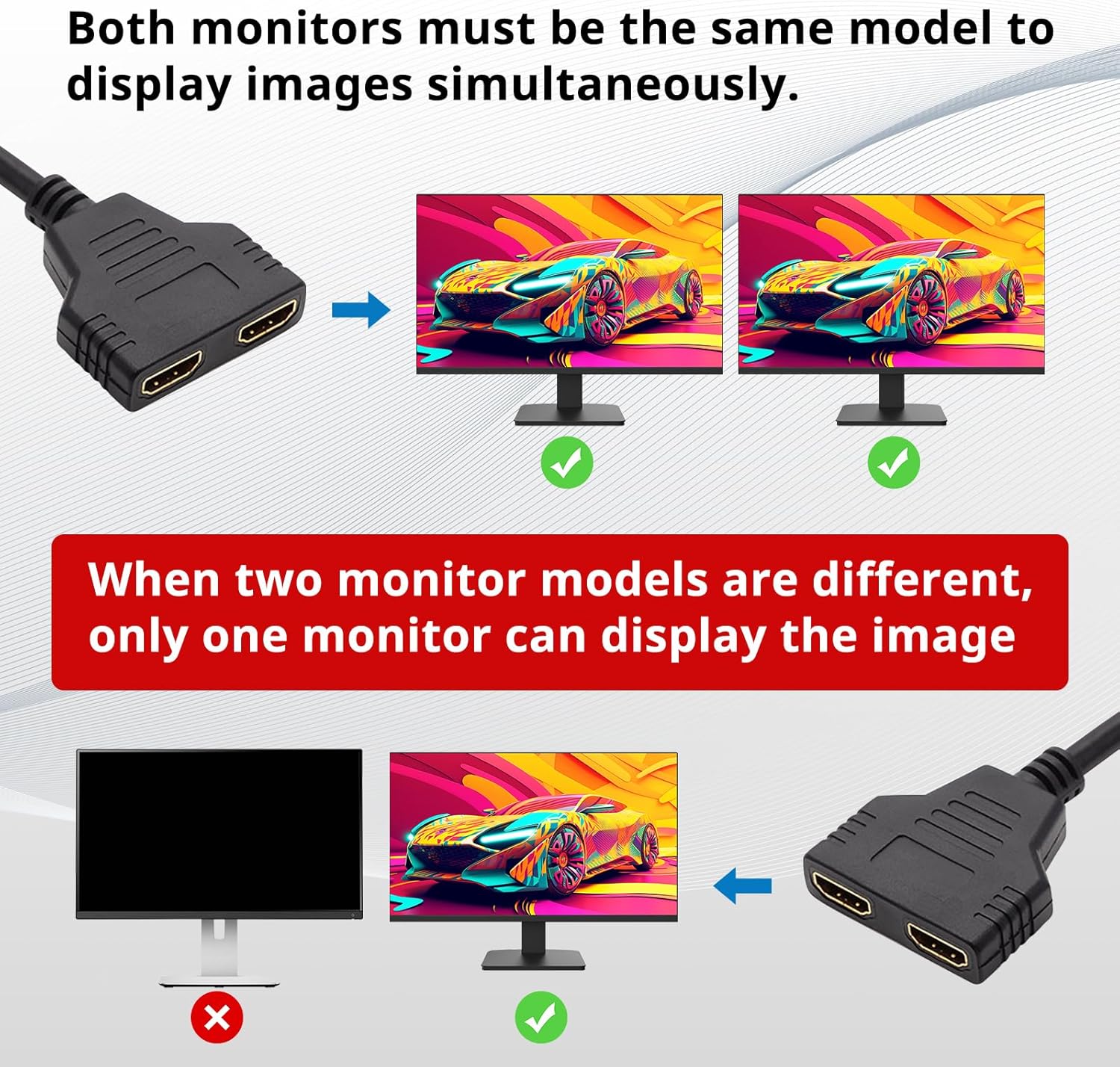 This passive HDMI splitter is designed for mirroring (displaying the same image on both screens) rather than extending the desktop. Its compact, lightweight build makes it an ideal audio-video accessory for portable setups or permanent installations. For best results, ensure both connected display devices are of the same model and resolution to maintain consistent synchronization.