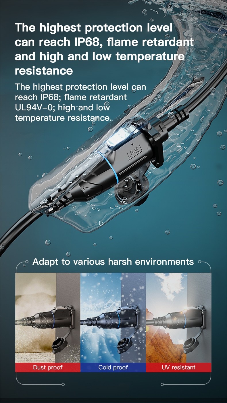 The highest protection level can reach IP68; flame retardant UL94V-0; high and low temperature resistance.