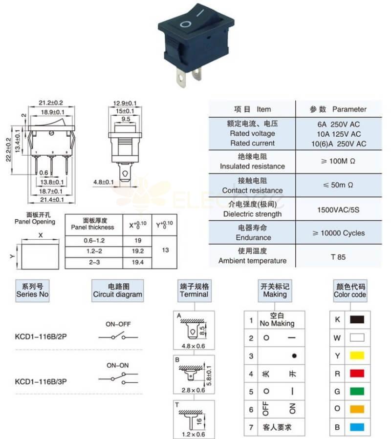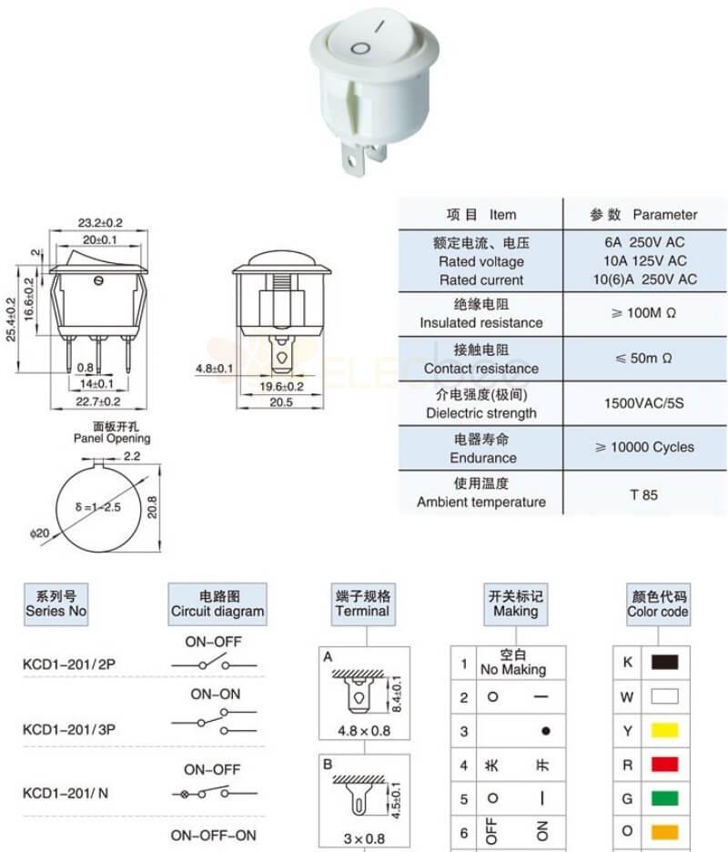 Elecbee 전선 및 단자 포함 원형 로커 스위치 - KCD1-101, 가전제품용 전선 포함