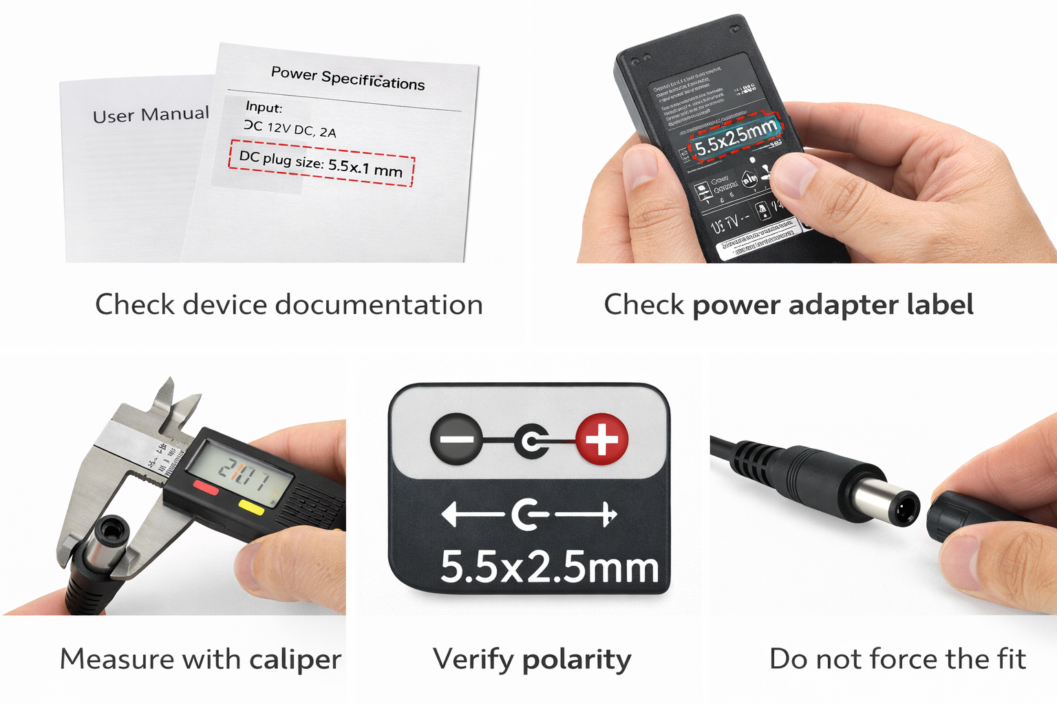 Даже если размер barrel-разъёма правильный, вам всё равно нужно подтвердить полярность. Центральный плюс очень распространён, но не является универсальным стандартом.