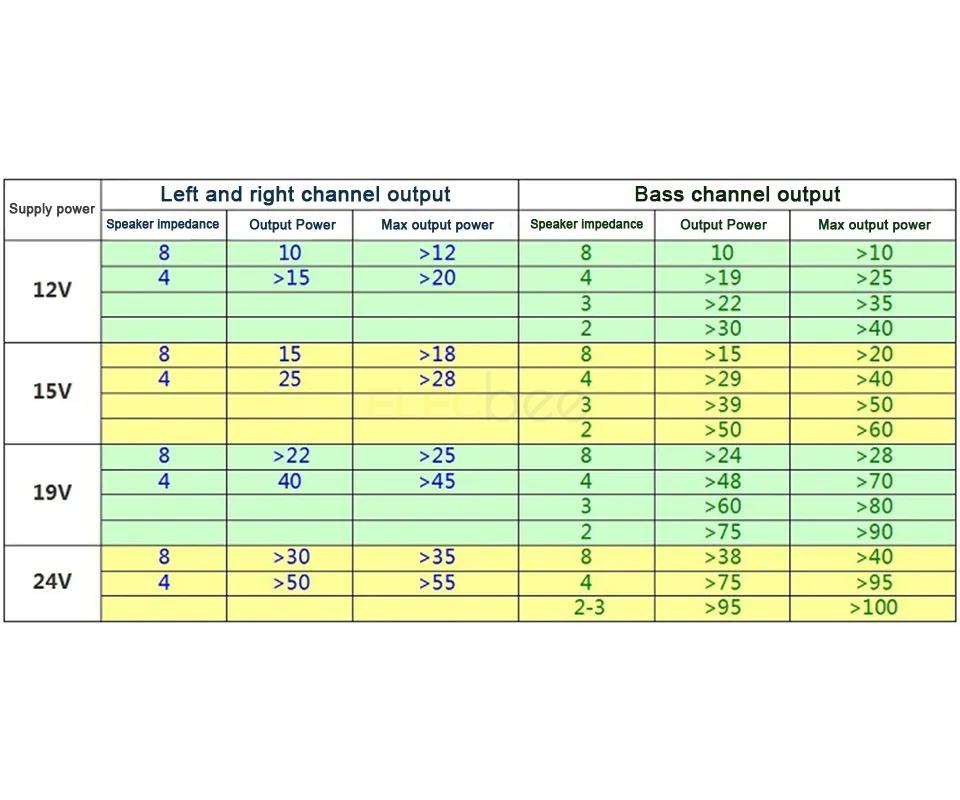 Выходная мощность связана с напряжением/током питания, импедансом динамика и размером аудио входа. Когда напряжение/ток источника питания достаточно, обычно напряжение питания выше, а относительная выходная мощность может быть увеличена. Динамики с разными импедансами имеют разные выходные способности. Обычно импеданс динамика меньше, и мощность легче достичь.