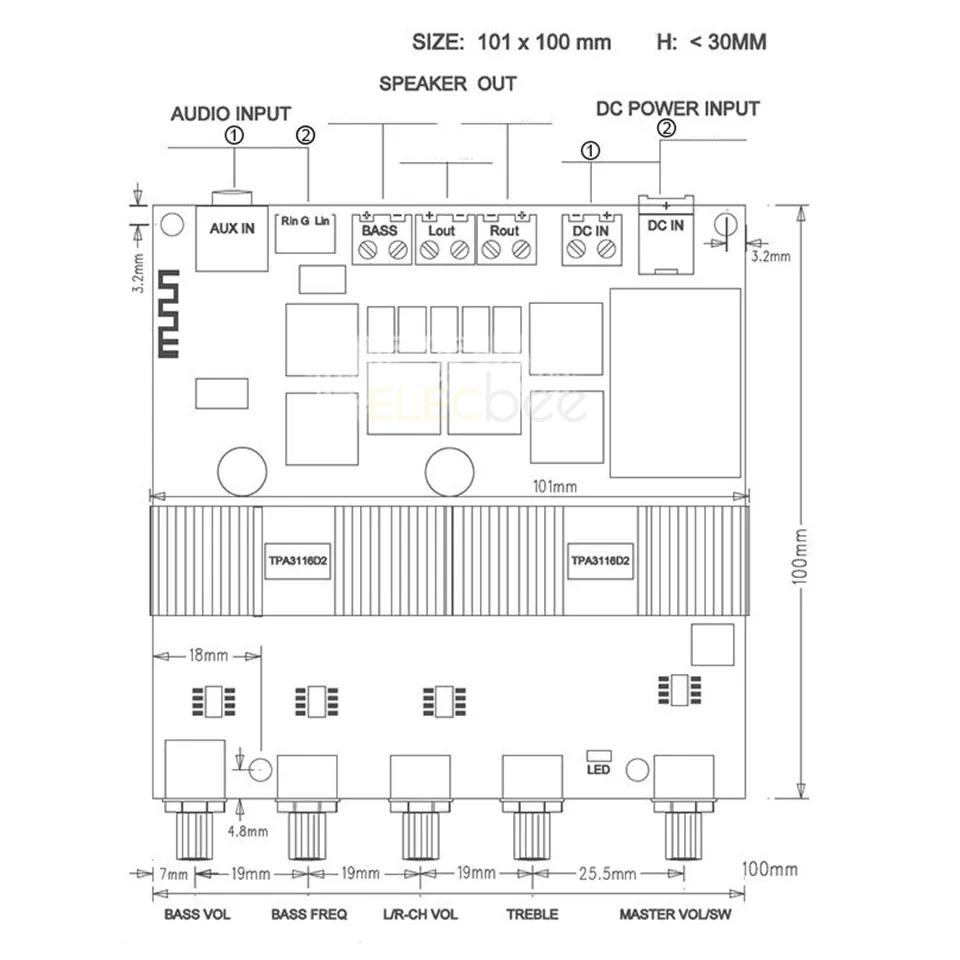 1. Это представляет собой источник питания 12-24 В, использующий мощность 12-24 В, с использованием высокопроизводительного чипа цифрового усилителя цифрового усилителя TI31166D2 в качестве ядра, один для выполнения выхода усиления мощности мостикового басового канала, один для выполнения выхода усиления мощности левого и правого канала.Поддержка 100 Вт (басовый канал) + 50 Вт (левый канал) + 50 Вт (правый канал) Трехканальный выход.
