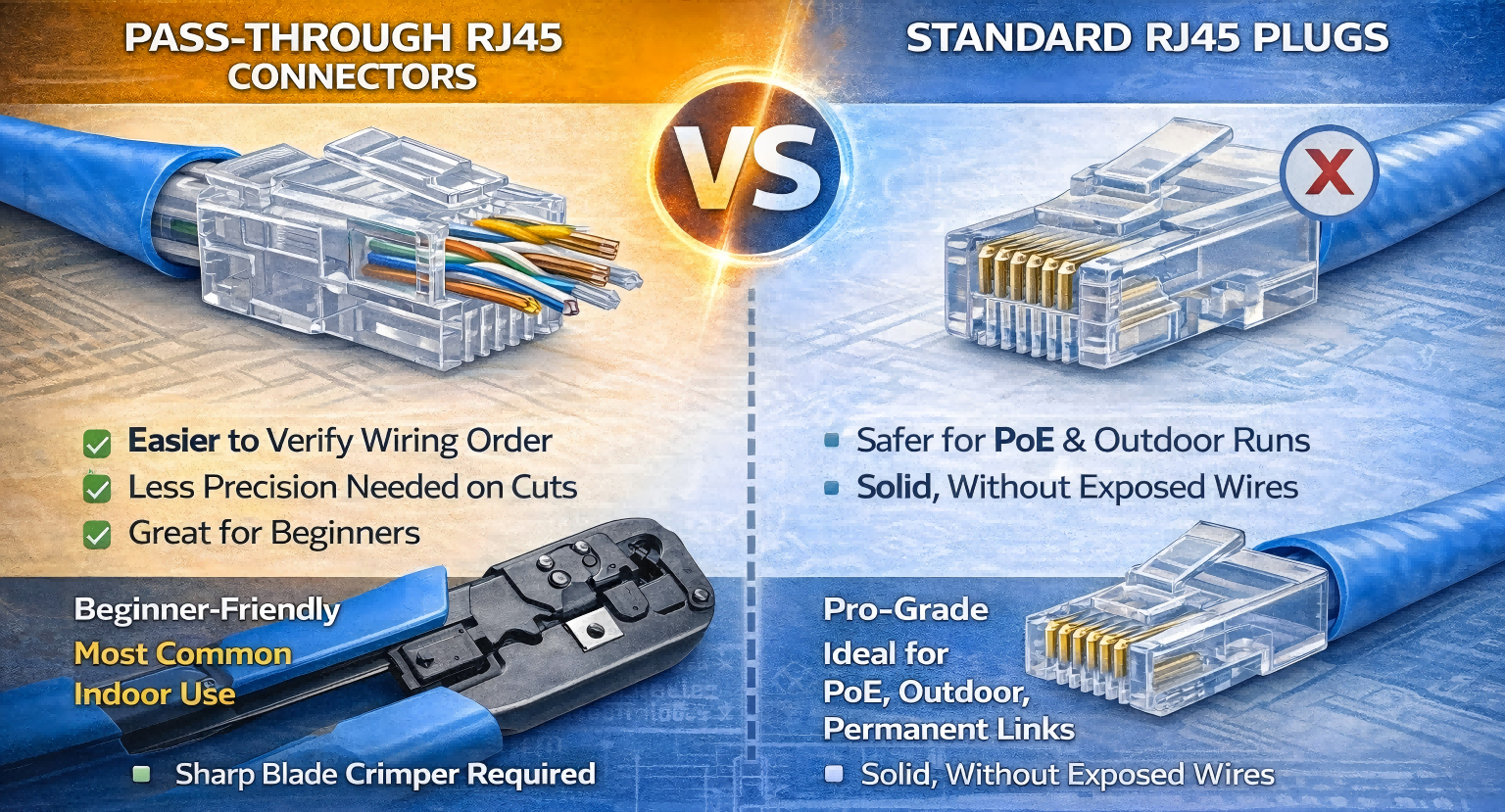 Kapalı ev ağı ve kısa yama koşuları için, iyi bir kıvrımlı geçiş uçları genellikle RJ45 konektörlerini sıkıştırmanın en başlangıç dostu yoludur. Dış mekan kabloları, PoE kameralar veya kritik kalıcı bağlantılar için, birçok profesyonel hala standart, geçişsiz fişleri veya tuş taşı krikolarını tercih eder.