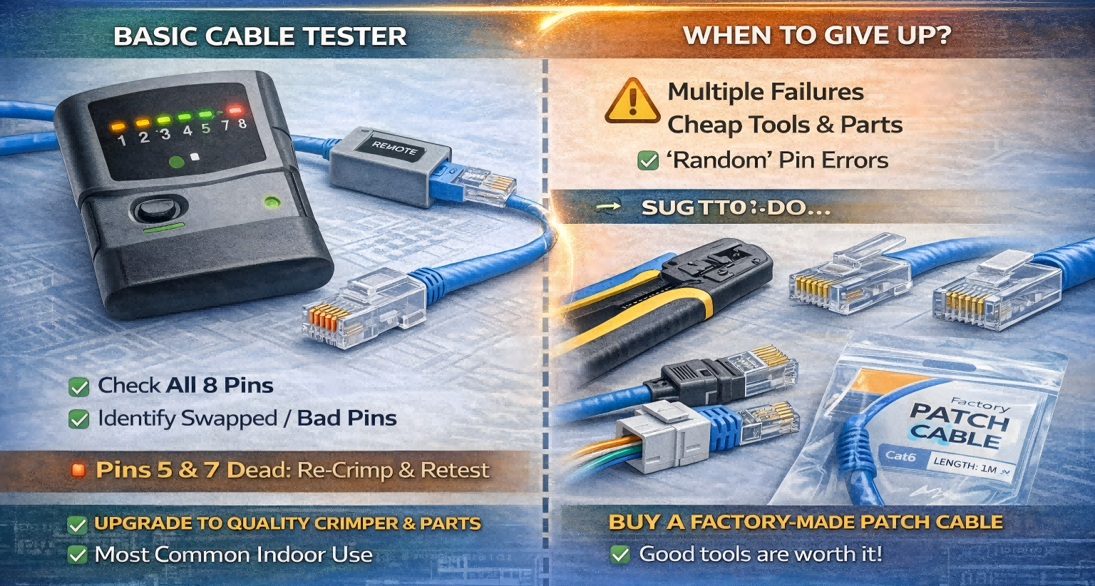 Çevrimiçi forumlar, kablo diyagramından takip ettiklerine yemin eden kişilerin gönderileriyle doludur, ancak test cihazı hala ölü pimler, rastgele başarısızlıklar veya hiç bir bağlantı göstermedi. İyi haber, bir RJ45 konektörünün tıkanmasının öğrenilebilir bir beceri olduğu ve çoğu başarısızlığın birkaç tekrarlanabilir hataya kadar gelmesidir.