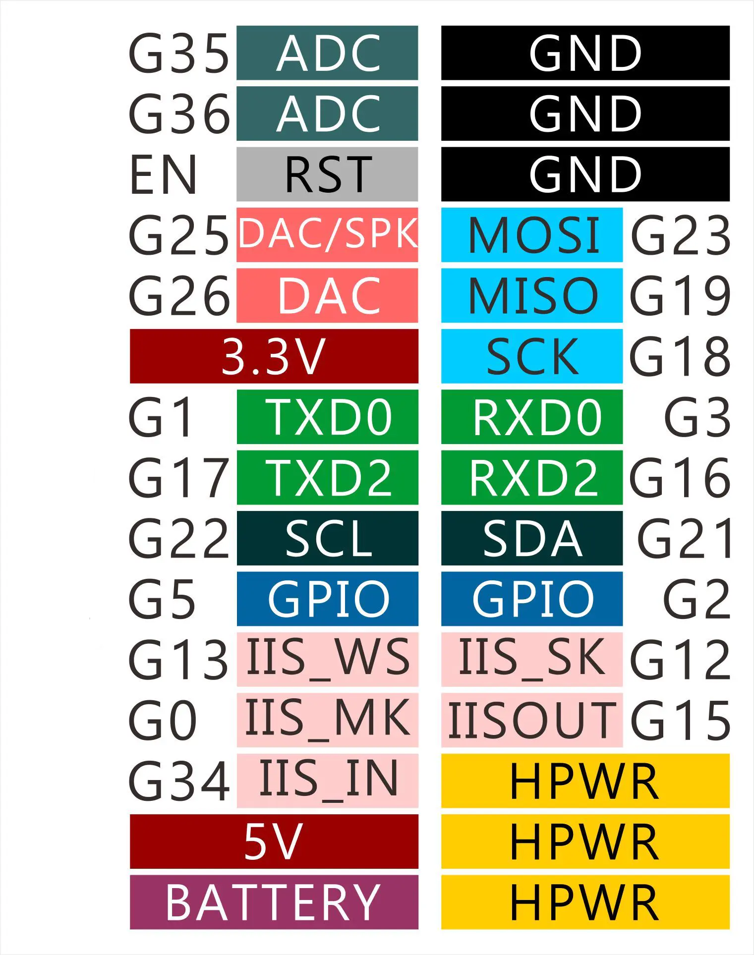| M5堆栈 | GPIO13 | GPIO18 | GPIO19 | GPIO23 | GPIO26 | GPIO34 | GPIO5 | GPIO15 |