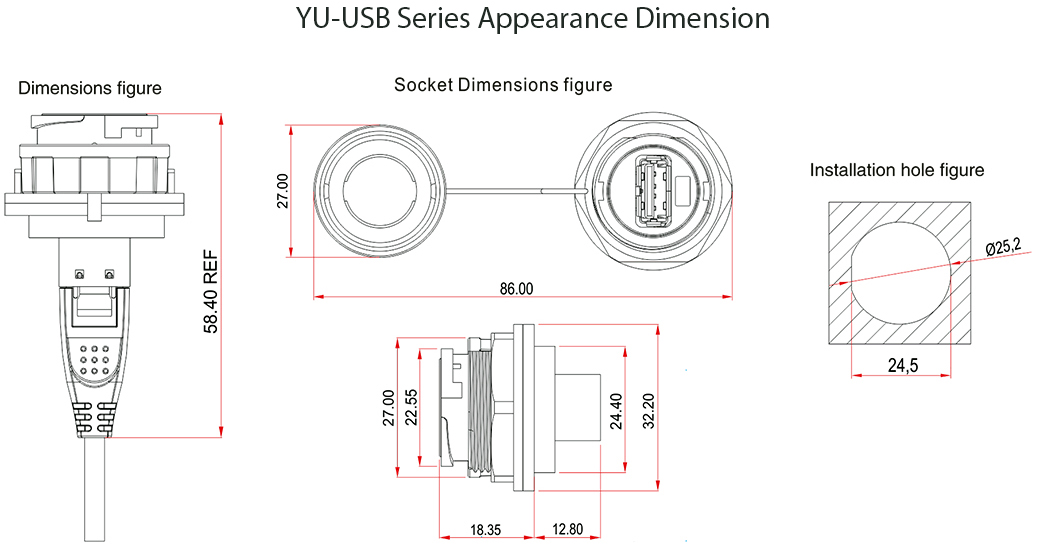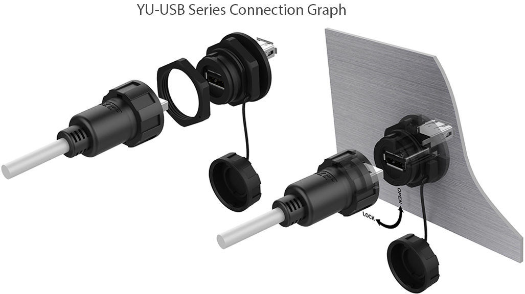 The YU-USB series connector, the shell protection device design of USB industrial protection, has good insulation properties while supporting USB2.0 and 3 using built-in external operation, can plug and play, hot-swappable, no need to open the chassis directly use the electrical junction box connection more convenient and reliable, fully meet the junction box demand. These connectors meet different needs of industry and satisfy with the International environment protection of Industrial equipment.
