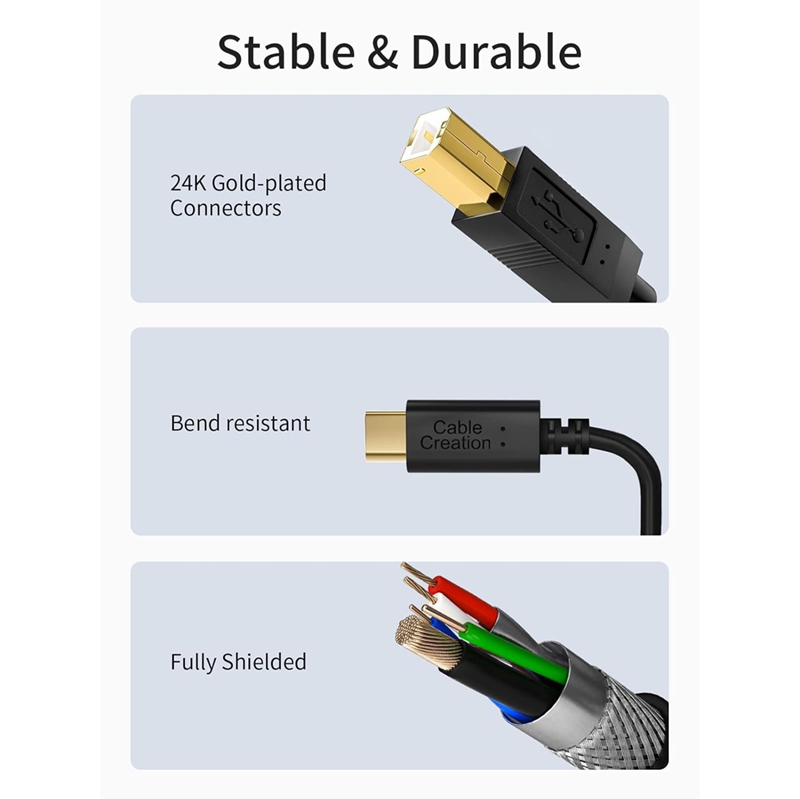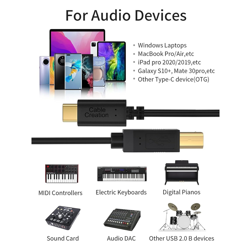 广泛的设备兼容性 - USB-C 端兼容 MacBook Pro/Air、Dell XPS 13/15、Surface Pro/Book 2 和 Chromebook Pixel;USB B 端可连接打印机、扫描仪、雅马哈/卡西欧数码钢琴和 BOSS 吉他音箱,满足您所有传统设备的需求。