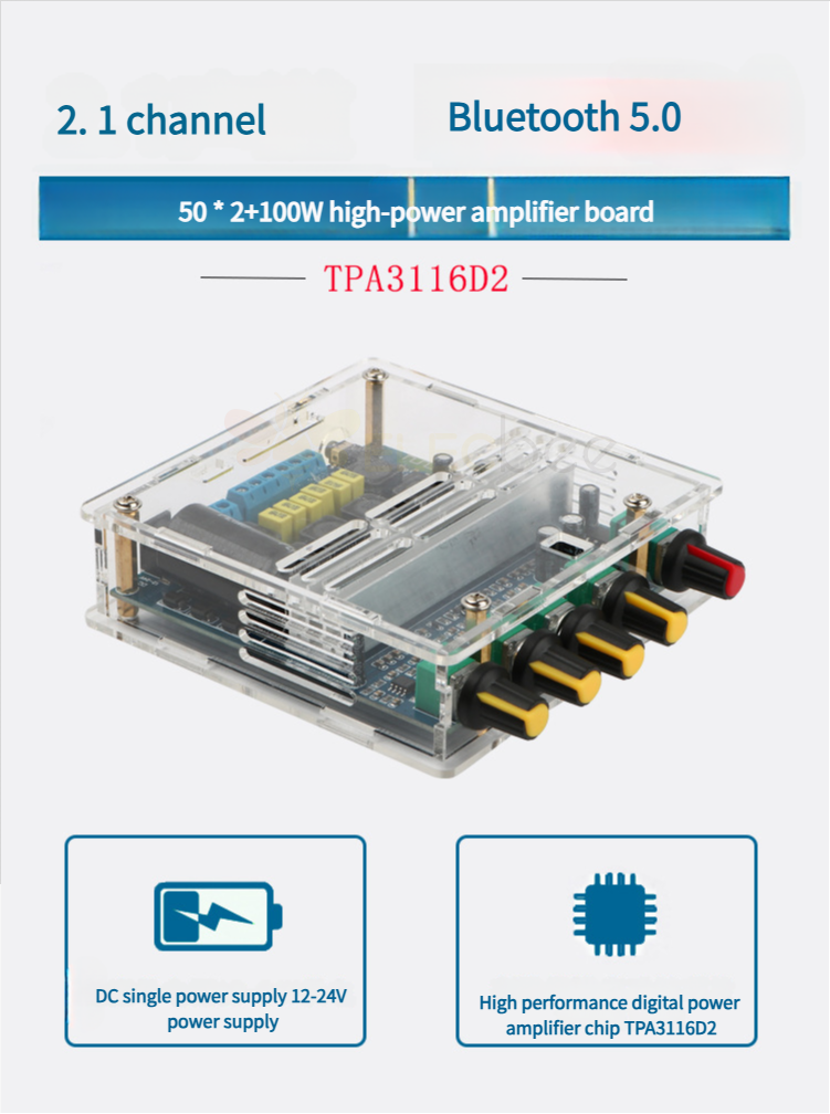 1、这是一款直流供电的12-24V电源,采用TI的TPA3116D2高性能数字功放芯片为核心,一个做并联桥接低音声道功放输出,一个做左右声道功放输出。 支持100W(低音声道)+50W(左声道)+50W(右声道)三声道输出。