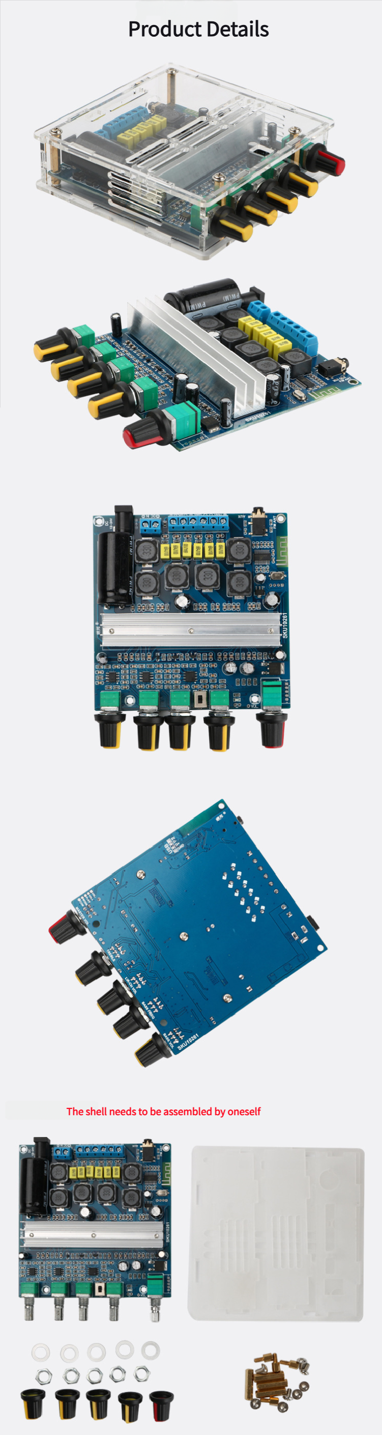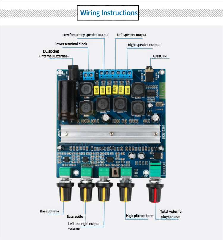 2.支持蓝牙音频接收,外接音频输入接口,带前置放大器,低音分频处理; 低音音量、低音频率、左右声道音量、高音、功能控制开关/总音量、5个调节电位器。