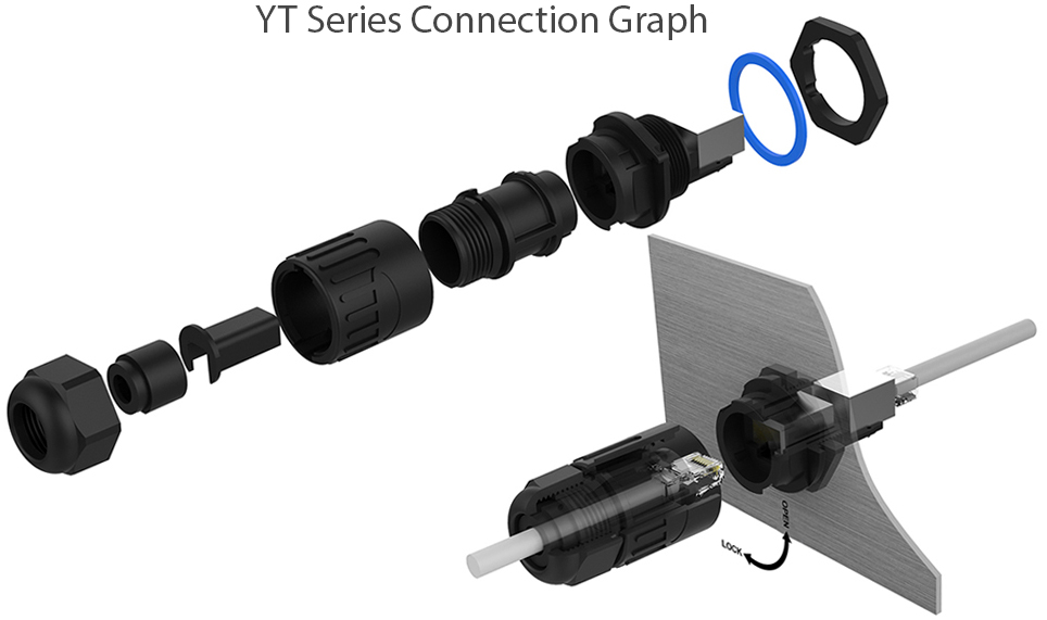 RJ45系列连接器具有1/4卡口连接和快速插拔等多种连接方式,适用于恶劣环境。 电缆护套采用实心压铸外壳和独特的电缆双夹线鞍座和护套,适用于普通RJ45插头电镀外壳防风雨。 这些连接器具有屏蔽系统,具有高频噪声抗扰度和电磁干扰保护,防护等级 IP65 防水防尘。 符合 EIA568B 和 ISO/IEC11801 的 D 级或 CAT 3e 标准,RJ45 连接器兼容 CAT5e,数据传输速率达到 10GBit/s。